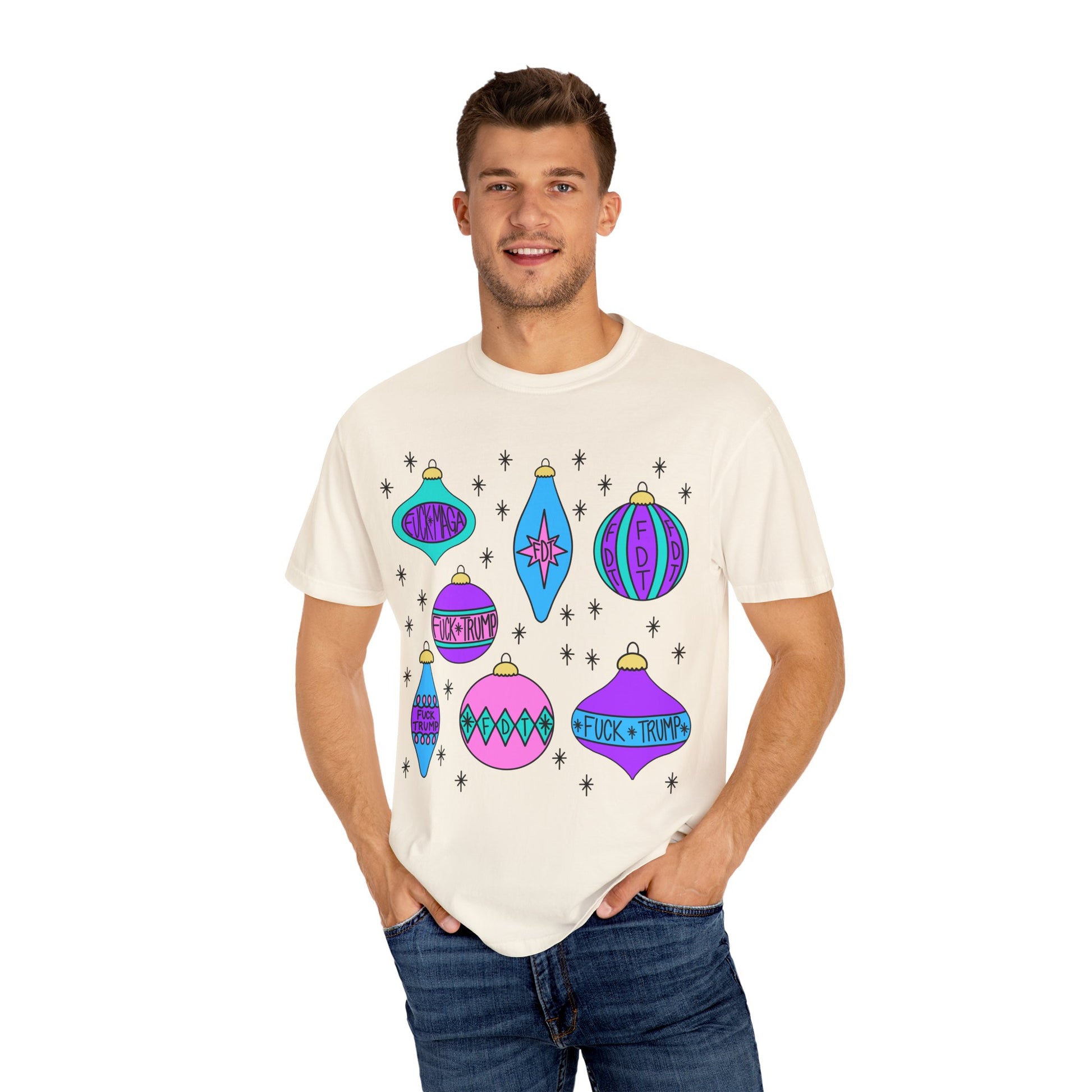 Celebrate your individuality with this stylish unisex garment-dyed T-shirt! Crafted for comfort, this tee offers a relaxed fit that feels soft against your skin, perfect for casual outings or cozy days at home. Its unique design features vibrant ornaments and playful text, creating a fun atmosphere that's sure to spark joy. Ideal for those who love to make a statement, this shirt is perfect for holiday gatherings, friendly meet-ups, or simply expressing your personality every day. Available in a wide range of sizes, this T-shirt caters to everyone, making it a meaningful gift for friends and loved ones during celebrations like birthdays, holidays, or just because!