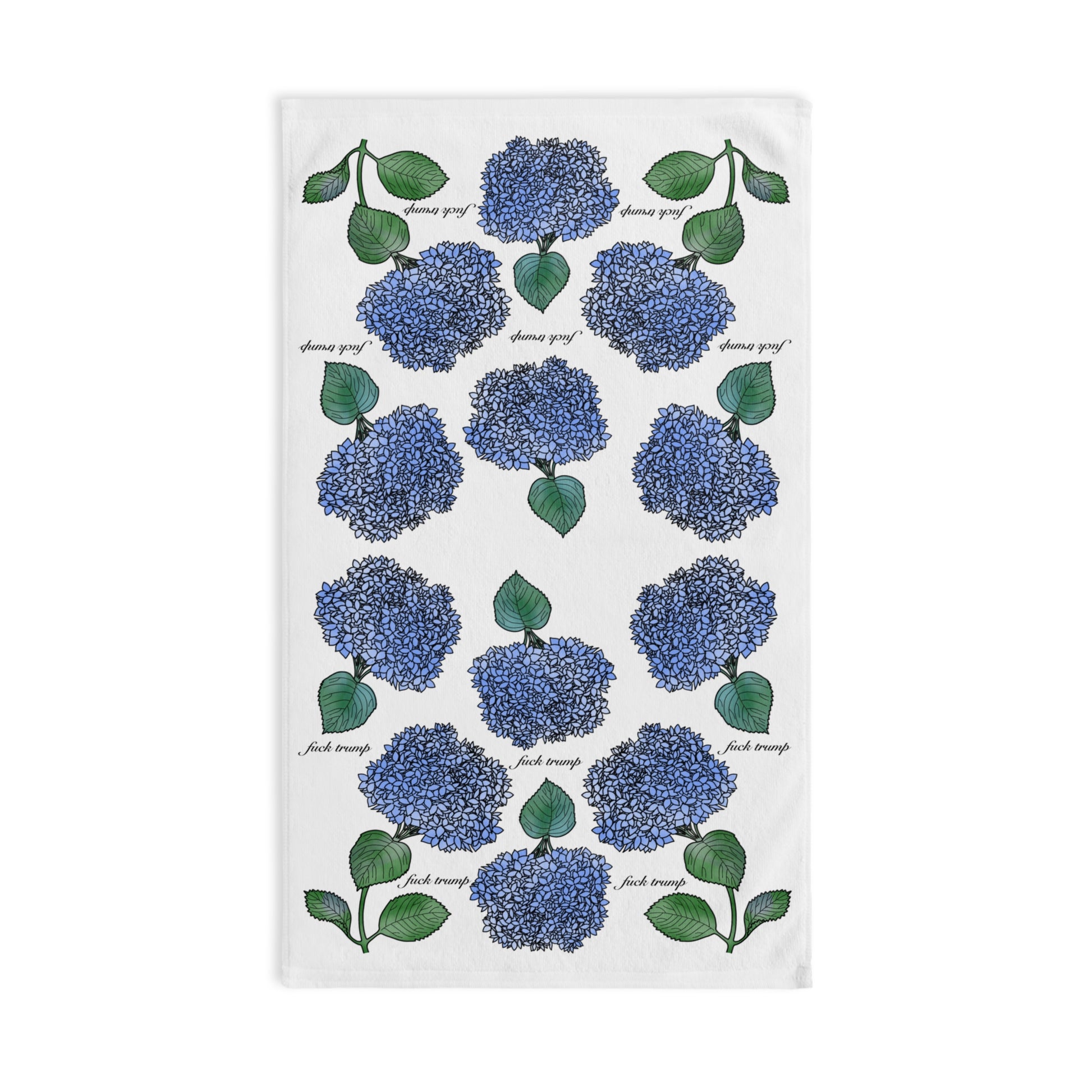 Slightly Subtle Hydrangea Towel on White, Floral Kitchen Decor, Gift for Gardeners, Blue Flower Towel, Spring Home Decor, Political Gag Gift