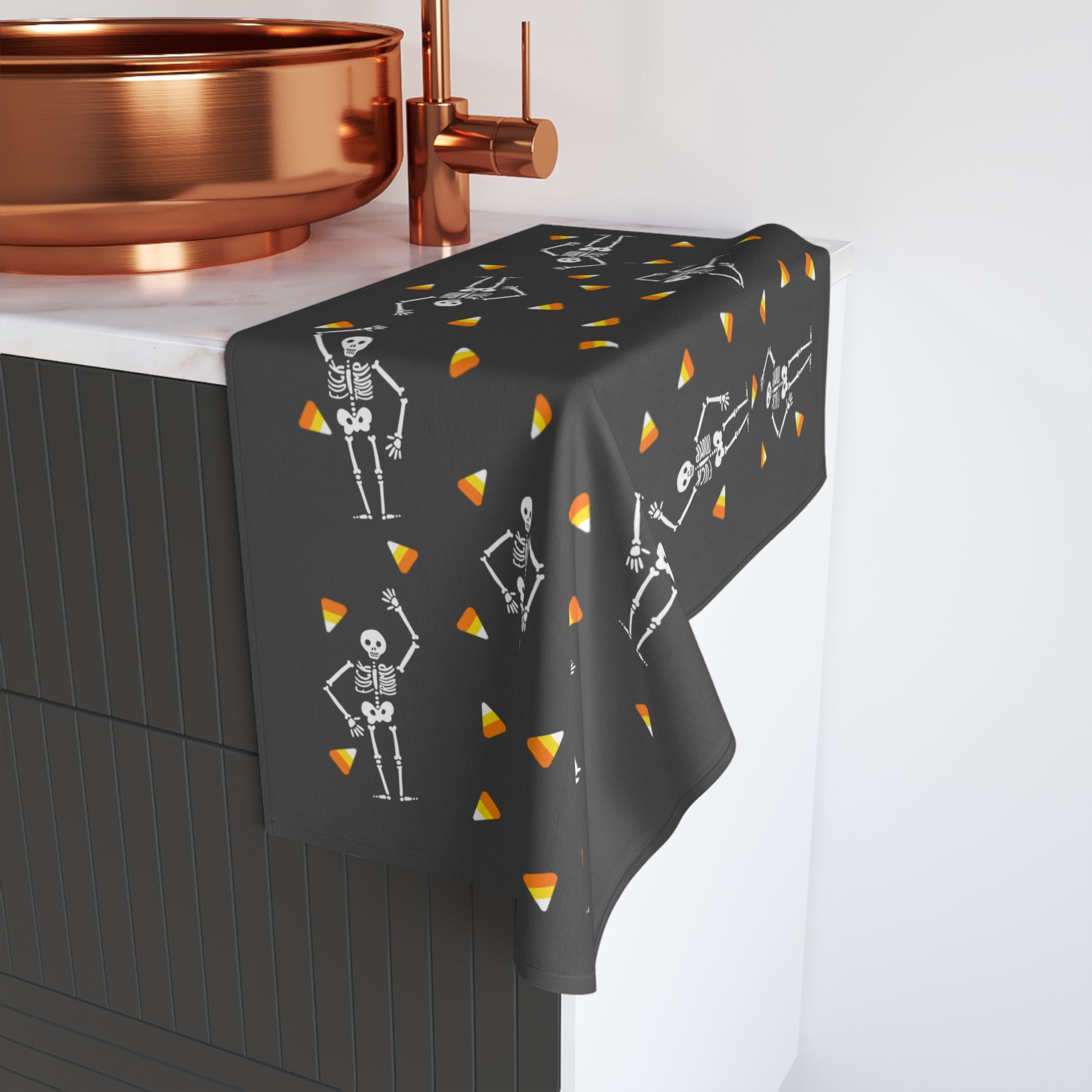 Introducing our whimsical Hand Towel, a delightful addition to your kitchen or bathroom decor. This towel features a playful skeleton and candy corn design, perfect for bringing a festive spirit to your Halloween celebrations. Experience the soft touch and vibrant colors that brighten up your space, making chores a little more cheerful. Its lightweight and absorbent material ensures it's not just eye-catching but also practical for daily use. Ideal for those who love to express their personality through unique home accessories, this towel is an excellent choice for anyone looking to add a touch of fun to their home. Celebrate not only Halloween but also every festive occasion with this charming piece, whether it's a spooky gathering or simply a cozy autumn evening at home.